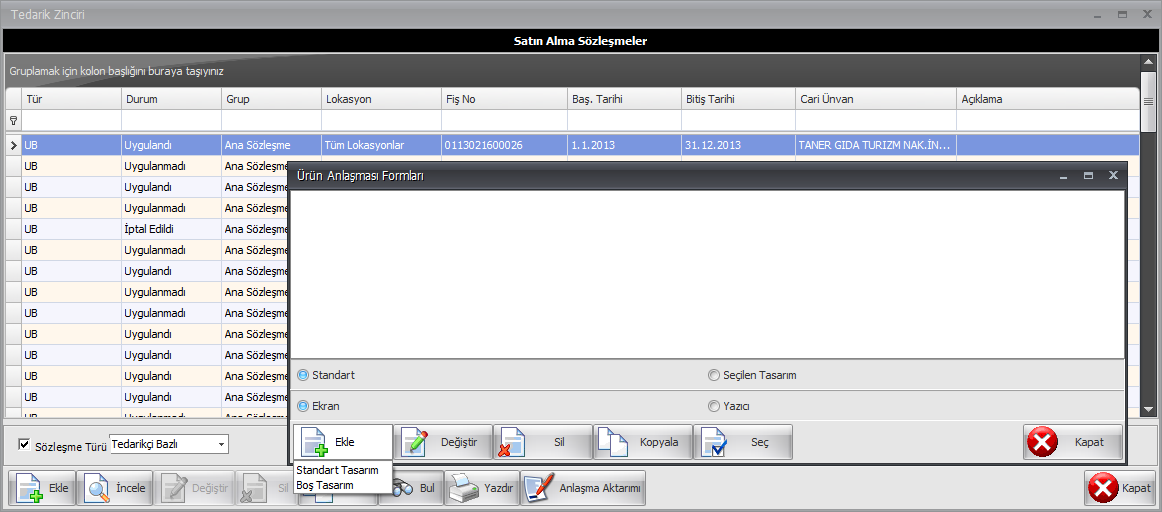 Daha önce düzenlenmiş sözleşmeler üzerinde Sağ Tıkla/F9 yapıldığı zaman İptal Et şeçeneğini kullanarak anlaşma iptal edilebilir. Sağ Tıkla/F9àYazdır işlemleri takip edildiğinde Ürün Anlaşma Formları ekranından kullanıcı Standart seçeneğini seçip Ekran seçeneğini işaretledikten sonra anlaşmanın standart windows tasarımını farklı bir pencerede görebilir.