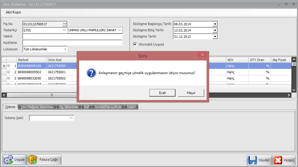 Anlaşmanın geçmişe yönelik uygulanması isteniyorsa Evet butonuna tıklanır.