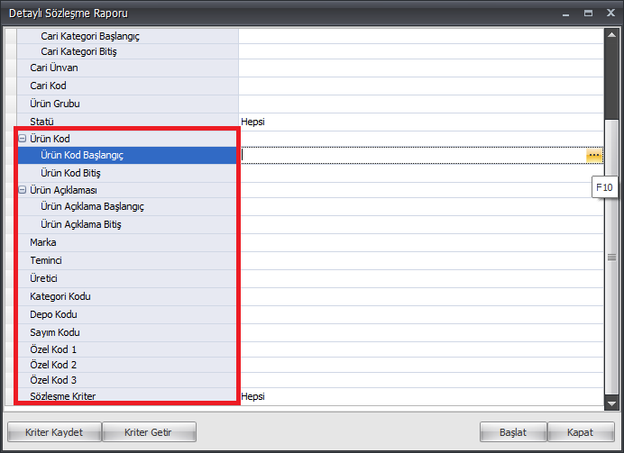 - Örneğin; Ürün Kod alanlarında yukarıdaki işlemler yapıldıktan sonra açılan Ürünler ekranından istenilen ürün seçimleri yapıldıktan sonra Seç butonuna tıklanarak seçilen ürün bazında raporlama yapılabilir. İlgili kriter seçimleri yapıldıktan sonra; Başlat butonuna tıklanır.