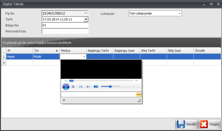 butonuna tıklanarak kayıtlı veri yüklenebilir. Reim yüklemede olduğu gibi ; Gösterim Başlangıç Tarihi, Bitiş Tarihi, Bitiş Saati ve Öncelik sırası belirlenir. Kaydet butonuna tıklanır. Bu şekilde bir kaç tane multimedia veri sıraya koyularak sergilenebilir.