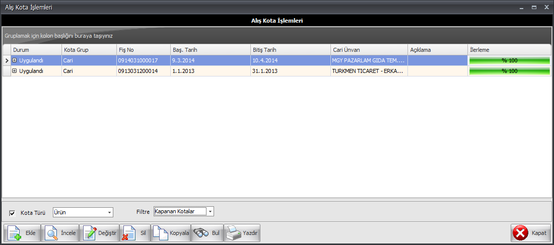 - Alış Kota İşlemleri ekranı iki bölümden oluşur. Sol bölümde cariler; sağ bölümde de daha önce seçilen cari ile yapılmış kotalar yer alır.