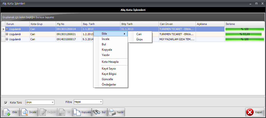 Kota Türü kontrol butonu aktifleştirilirilip Ekle butonuna tıklanarak veya Sağ TıklaàEkle işlemleri takip edilerek cari veya ürün bazlı alış kota anlaşmaları düzenlenebilir.