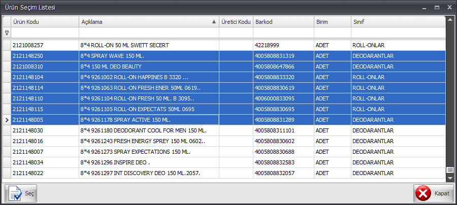 - Yukarıdaki özelliklerden biri kullanılarak ürün seçildiği zaman Ürün Seçim Listesi ekranında istenilen ürün seçilebilir veya Shift tuşu ile çoklu seçim yapılarak arama kriterleri aynı olan ürünler için otomatik sipariş talebi oluşturulabilir. Ürün/ürünler seçildikten sonra Seç butonuna tıklanır.