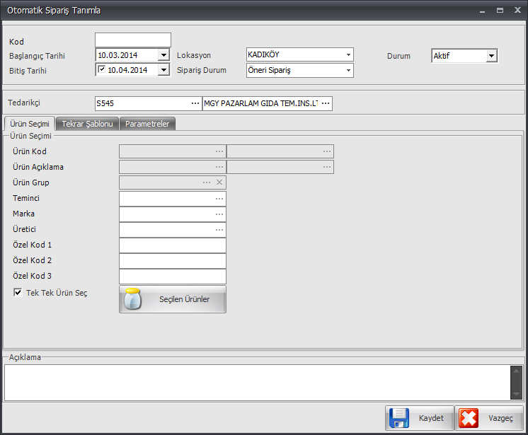 - Başlangıç ve Bitiş Tarihi: Otomatik sipariş bu tarihler arasında aktiftir.
