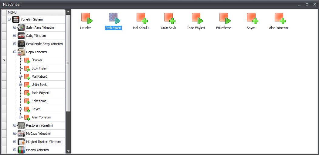 Erişim ağacından Yönetim Sistemi-->Depo Yönetimi/Restoran Yönetimi/Magaza Yönetimi-->Stok Fişleri işlemleri takip edilir.