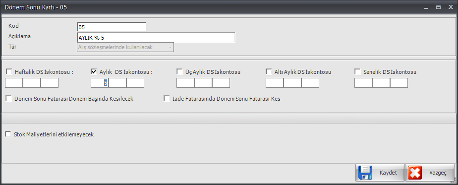 Dönem içinde veya dönem sonunda; anlaşmaya göre tedarikçiden satın alma işleminde yapılacak olan iskontolar düzenleyici hesaplara alınmışsa, ilgili fark hesaplarının kapatılması gerekir. Bu hesap farkları haftalık, aylık, üç aylık, altı aylık ve yıllık olarak hesaplara yansıtılabilir. Seçilen döneme göre hesaba % kaç oranda yansıtılacağı belirlendikten sonra dönem sonu kart tanımı yapılır.