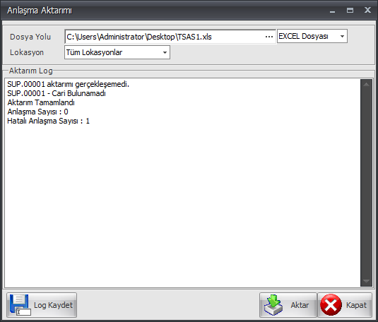Log Kaydet butonu ile de aktarım işlemine dair log kaydı tutulabilir.