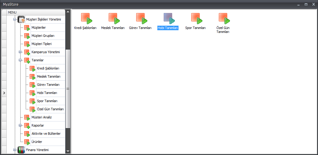 Hobi kartlarının tanımlandığı alandır. Müşteri tanım kartları oluşturulurken müşterileri daha yakından tanımak adına varsa edindikleri hobileri belirtmek için buradan tanımlanan hobi kartları kullanılır.