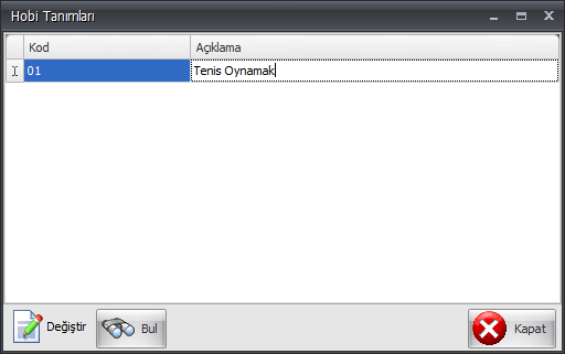 Açılan Hobi Tanımları ekranında Değiştir butonuna tıklanır. Değiştir butonuna tıklandıktan sonra aktifleşen işleme satırında Kod kolon başlığı altından tanımlacak olan hobi tanımının kodu, sırası girilir. Açıklama kolon başlığı altından da hobi adı girilir. Bu işlemler tekrar edilerek diğer hobiler de tanımlanabilir.