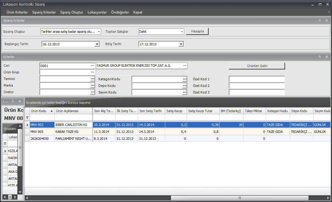 istenen kriter seçildikten sonra Hesapla butonuna tıklanır. Örneğin; yukarıdaki ekranda ''Tarihler arası satış kadar sipariş oluştur'' kriteri seçilmiştir. Bu seçime bağlı olarak da baz alınacak perakende satışların başlangıç ve bitiş tarihleri seçilmiştir.