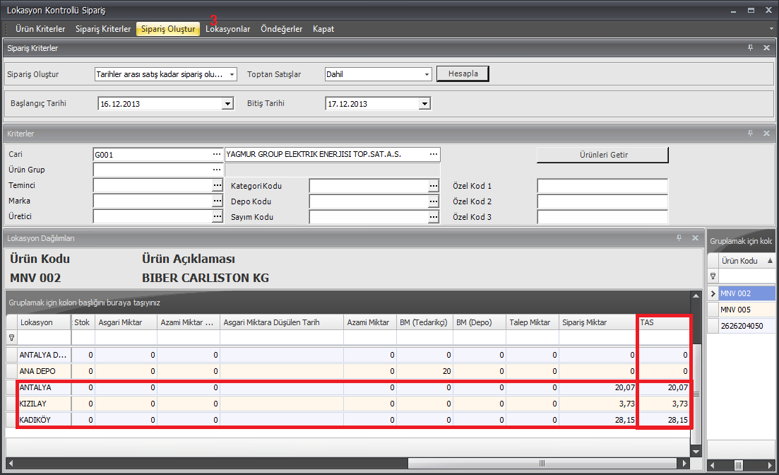 - Hesapla butonuna tıklandıktan sonra ilgili seçime bağlı olarak Lokasyon Dağılımları tablosunda, TAS(Tarihler Arası Satış) kolon başlığı altından seçilen ürünün satıi miktarları görülebilir. Bu miktarlara göre sipariş oluşturulacaksa Sipariş Oluştur sekmesine tıklanır. Burada dikkat edilirse seçilen tarihler arasında seçilen ürünün sadece üç lokasyonda satışı gerçekleşmiştir.
