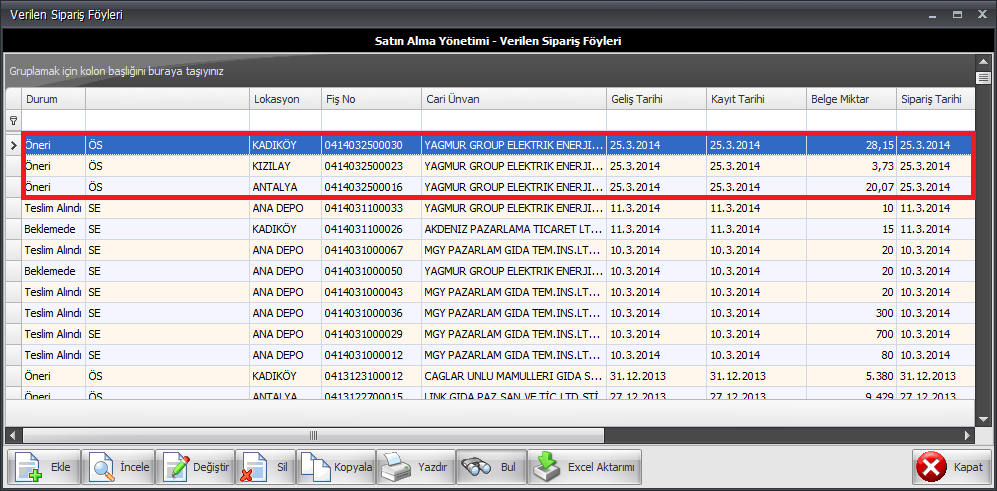 - Kaydedilen Siparişler Öneri Sipariş olarak Satın Alma Yönetimi-Verilen Sipariş Föyleri ekranına düşer.