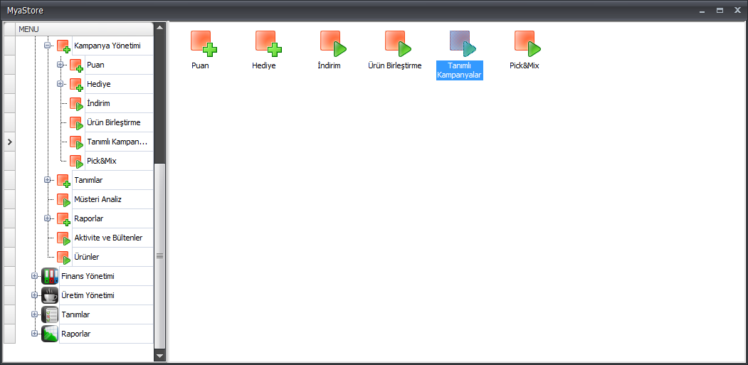 Myasoft'ta daha önce ilgili alanlardan geliştirilmiş ve uygulamaya konulmuş Ürün Birleştirme, Puan kampanyaları ve İndirim kampanyalarının hepsinin toplandığı alandır.