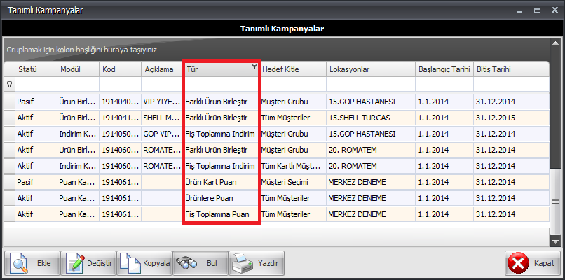 - Açılan Tanımlı Kampanyalar ekranında aktif-pasif bütün kampanyalar listelenmiş olarak görülür.