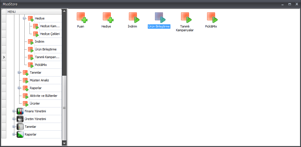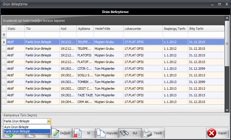 Açılan Ürün Birleştirme ekranında Kampanya Türü Seçiniz alanından istenilen kampanya türü seçildikten sonra Ekle butonuna tıklanarak veya Sağ Tıkla/F9-->Ekle-->Aynı/Farklı Ürün Birleştir işlemleri takip edilirse ürün yerleştirme metodu ile yeni kampanya tanımları yapılabilir.