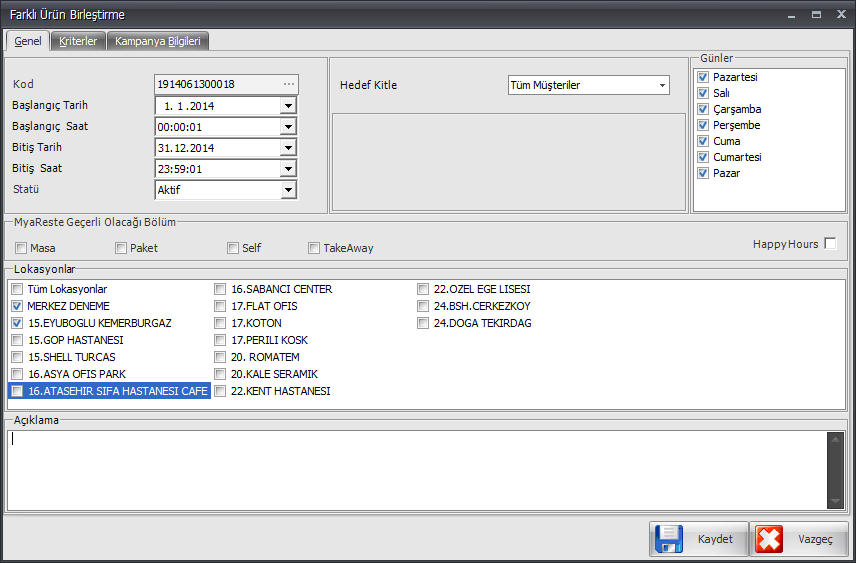 - Lokasyonlar alanından kampanyanın geçerli olacağı lokasyon/lokasyonlar veya tüm lokasyonlar seçimi yapılır.