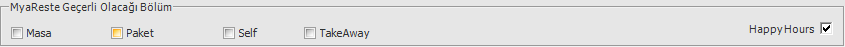 Kampanya, ön office yazılımı olan MyaRes'te hangi satışlarda geçerli olacaksa o satış/satışlar seçilir. Happy Hours/Masa/Paket/Self/Takeaway gibi.