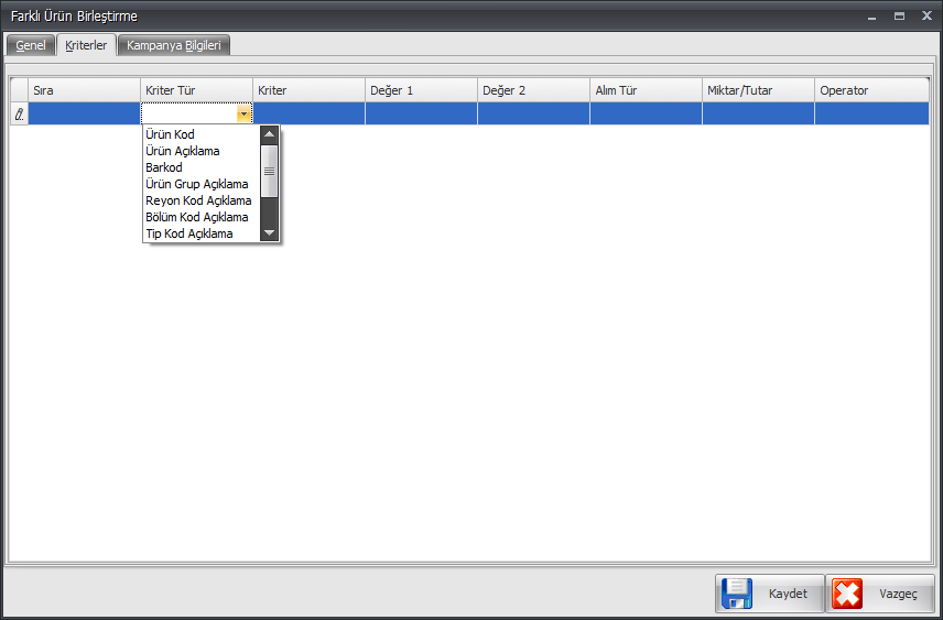 İlk olarak Kriter Tür kolon başlığı altından birleştirilerek satılacak ürünlerin özellikleri arasından istenilen kriter seçilir.