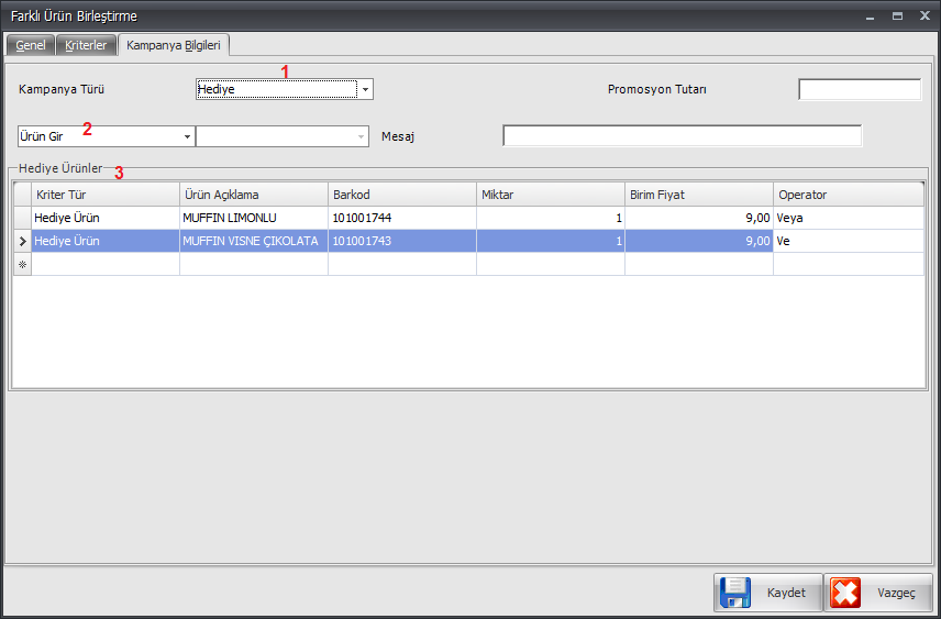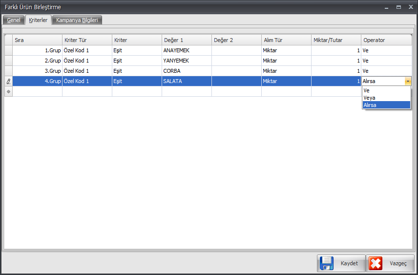 - Her satır işlemlerinden sonra Operatör kolon başlığı altından ''ve'' operatörü seçimi yapılırsa ilk satırda seçilen ürün ile birlikte ikinci satırda seçilen ürün aynı anda alınırsa kampanya geçerli olacaktır.