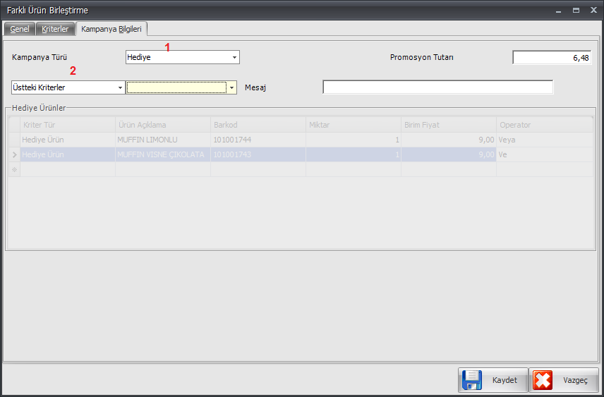 - Operatör alanından ''ve'', ''veya'', ''ve alırsa'' operatörleri kullanılarak müşteriye hediye ürün seçenekleri sunulabilir.