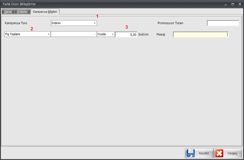 Eğer Kampanya Türü 1 alanından İndirim seçeneği seçilip, 2 alanından da Fiş Toplam seçeneği seçilirse Yüzde alanının karşısındaki alana fiş toplamı üzerinden müşteriye % kaç oranında indirim yapılacaksa o oran girilir.
