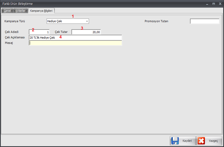 Eğer Kampanya Türü 1 alanından Hediye Çeki seçimi yapılırsa;