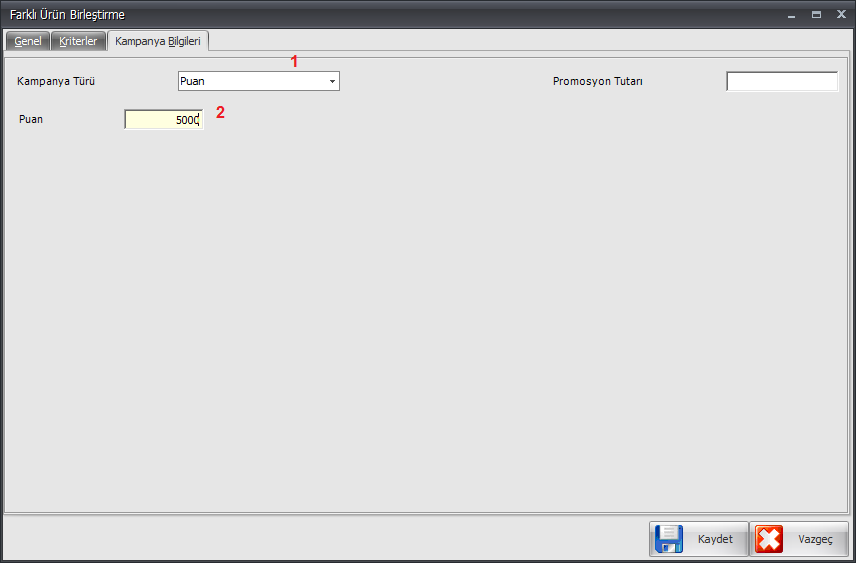 - Eğer Kampanya Türü 1 alanından Puan seçeneği seçilirse, Puan alanından müşterinin kampanya koşullarını sağladığı takdirde kazanacağı puan girilir.