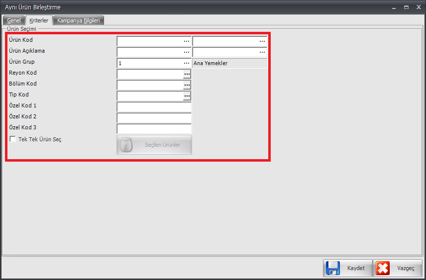 - Kriterler menüsünde ise aynı özelliklere sahip olan ürünler, Ürün Seçimi tablosu altındaki ürün özellikleri kullanılarak belirlenebilir.
