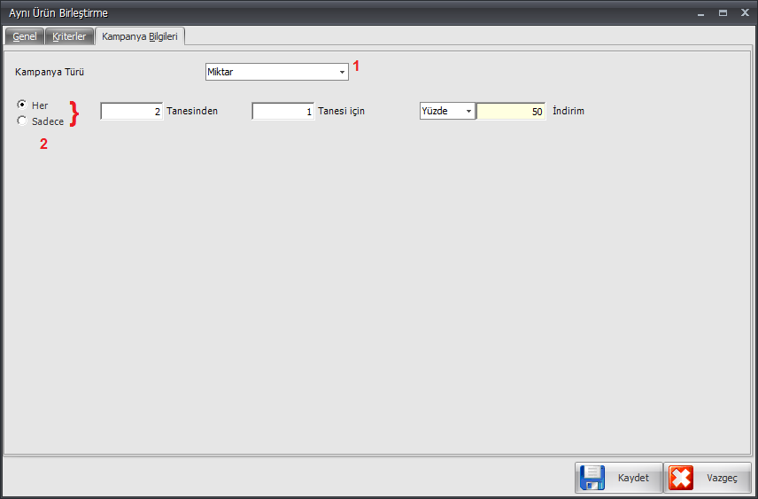 Kampanya Bilgileri menüsü altından da Kampanya Türü 1 alanından Miktar/Tutar seçeneklerinden istenilen seçim yapıldıktan sonra 2 alanından Her seçimi yapılırsa;