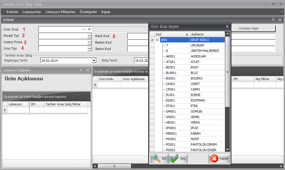 Ayrıca Ürün Satış Takip ekranı pivot grid özelliğine sahiptir. Lokasyon Dağılımları ve Kriterler tablosunun yerleri değiştirilebilir. Örneğin; yukarıdaki ekranda Lokasyon Dağılımları tablosu sürüklenerek ekranda görünen noktalarda istenilen nokta seçilip üzerine bırakılırsa;