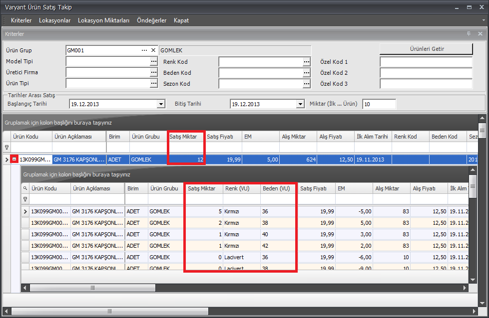 Yine aynı tablo altından ürünün kırılımı açılırsa toplam satış miktarını oluşturan varyant ürünler ayrıntılı olarak görülebilir. Bu ürüne ait kırılım açıldığı zaman seçilen ürüne ait tüm varyant ürünler(satışı gerçekleşen-gerçekleşmeyen) miktarlarıyla birlikte ayrıntılı olarak listelenir.